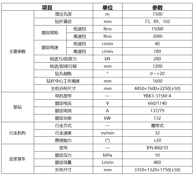 2、采用大功率主機(jī),動(dòng)力頭轉(zhuǎn)矩大、給進(jìn)機(jī)構(gòu)起拔力大,大大提高了在施工過(guò)程中處理抱鉆、卡鉆等事故的能力;