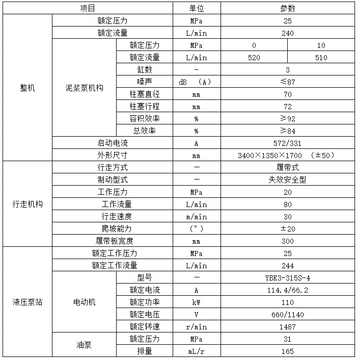 1、為了便于井下運(yùn)輸,單獨(dú)設(shè)計(jì)可獨(dú)立行走的大流量泥漿泵車(chē),最大額定流量可達(dá)510L/min。泵車(chē)使用進(jìn)口高性能泥漿泵,采用徑向柱塞馬達(dá)驅(qū)動(dòng)泥漿泵。泥漿泵供水壓力大,排渣能力強(qiáng),在鉆進(jìn)松、散、軟、弱層段時(shí),能將巖屑及時(shí)排出,避免二次切削,提高了鉆進(jìn)效率。