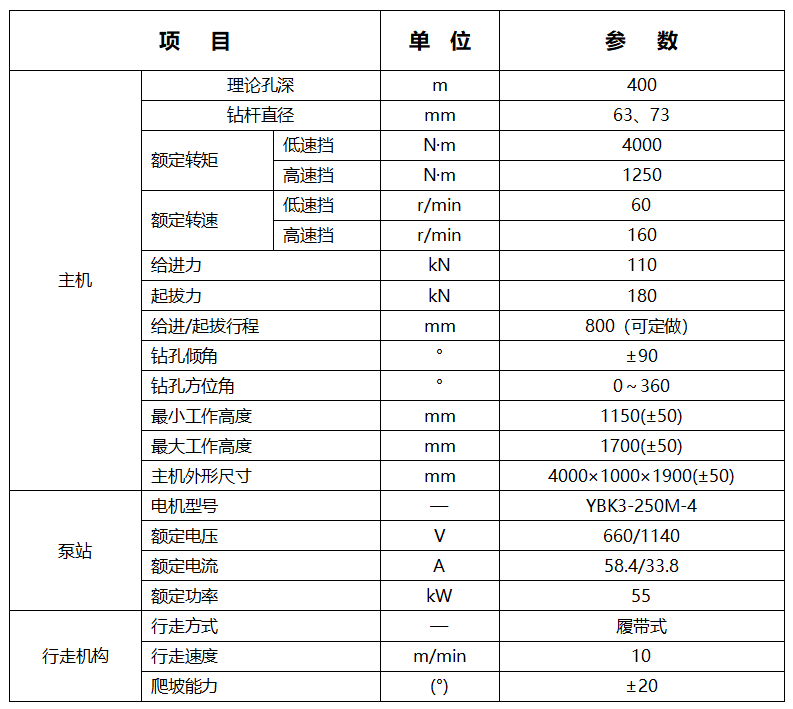 ZDY4000LP煤礦用履帶式全液壓坑道鉆機參數表